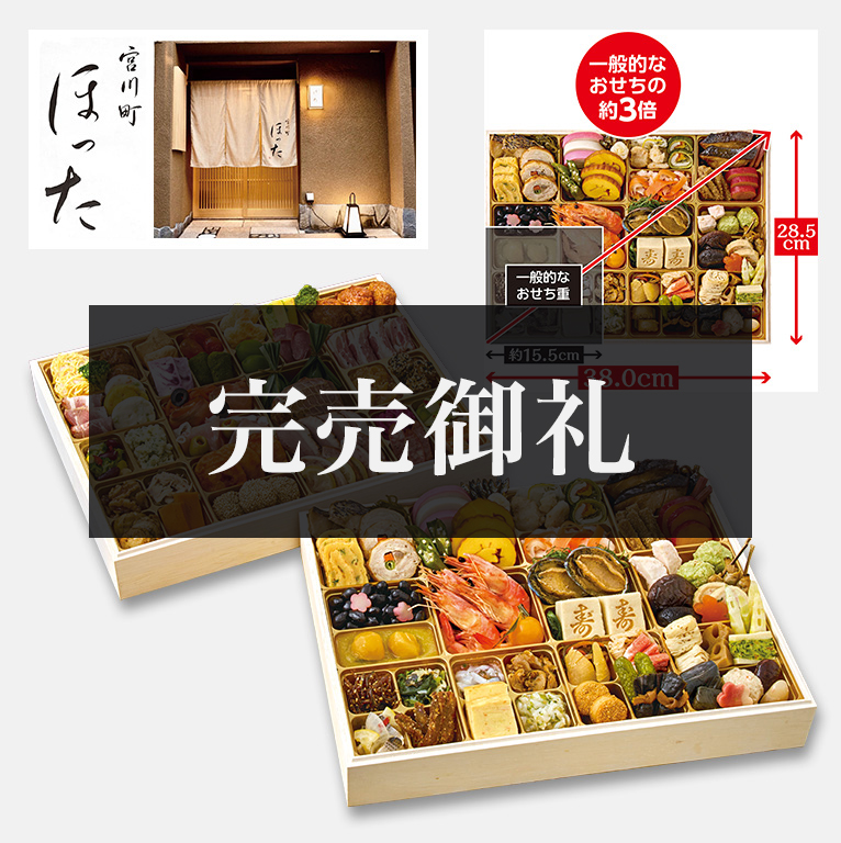 京都の名店「祇園さゝ木」で修業した店主 堀田 功雄氏が監修したおせち。二段で100品目を詰合せた豪快なおせちです。