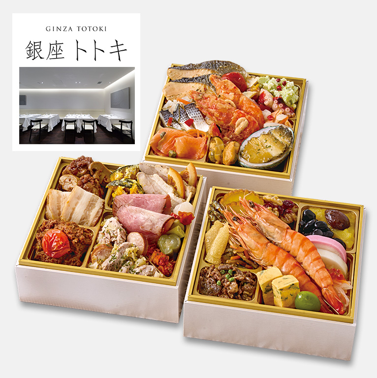 現代の名工受賞した「銀座トトキ」十時シェフが監修したおせち。一の重は、定番の和風おせち。二の重は、肉をテーマにした肉おせち。三の重は、海鮮をテーマにした海の幸おせちが楽しめる三段おせちです。