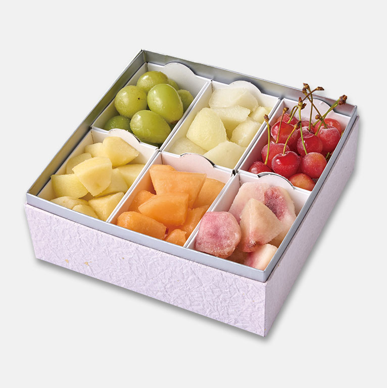 シャーベット感覚で楽しめる冷凍フルーツをお重に詰合せました。皮むきも不要で、1種類毎に小箱に入っているのでお好きな時に半解凍してお召し上がりください。