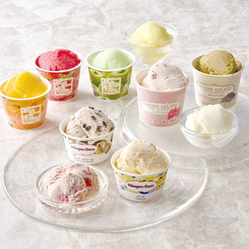 ハーゲンダッツラバーズアソート(バニラ・ストロベリー・クッキー&クリーム)各70ml×各2、KAMANARIYAイタリアンジェラート(ミルク・一番茶ほうじ茶・苺ミルク)各100ml、フルーツティアラソルベ(イチゴ・青リンゴ・パインアップル・ミカン)各108ml