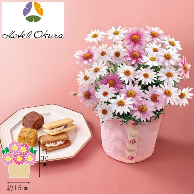 花色の変化が楽しめるマーガレット(さくらべーる)と「ホテルオークラ」の洋菓子をセットでお届け。