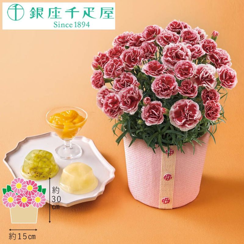 カーネーション5号鉢、バスケット 、お手入れのしおり、銀座ゼリー(マンゴー・キウィ・グレープフルーツ)各75g ”商品サイズ:幅約15cm×高さ約30cm”