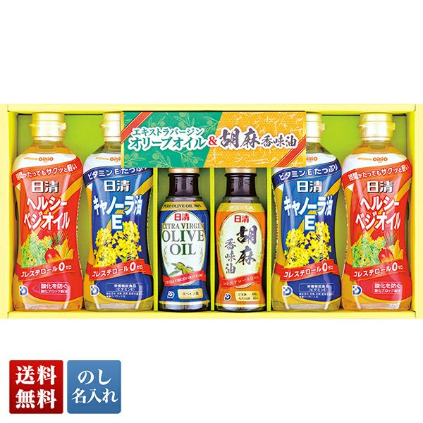 人気の「日清キャノーラ油E」に時間がたっても「カラッと長持ち」の「日清ヘルシーベジオイル」、「日清エキストラバージンオリーブオイル」、「日清胡麻香味油」の詰合せ。