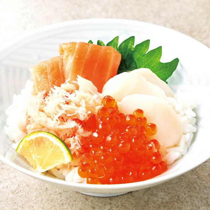 ずわい蟹、いくら、帆立など4種類の海鮮素材が入ったどんぶりの具。ご飯の上にのせるだけで簡単に海鮮どんぶりが楽しめます。