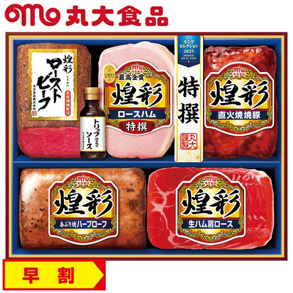 ローストビーフ(モモ)・特撰ロースハム各180g、直火焼焼豚・あぶり焼ハーブローフ各170g、生ハム肩ロース36g、トリュフ仕立てソース90ml