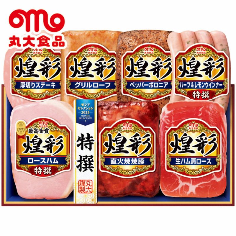 特撰ロースハム180g、直火焼焼豚170g、厚切りステーキ・グリルローフ・ペッパーボロニア各110g、特撰ハーブ&レモンウインナー80g、生ハム肩ロース36g