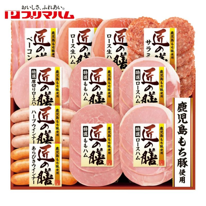 特選ロースハム36g×2、特選ももハム40g×2、特選厚切りロースハム45g、ベーコン40g、ウインナー(あらびき・ハーブ)各70g、ロース生ハム32g×2、サラミ36g