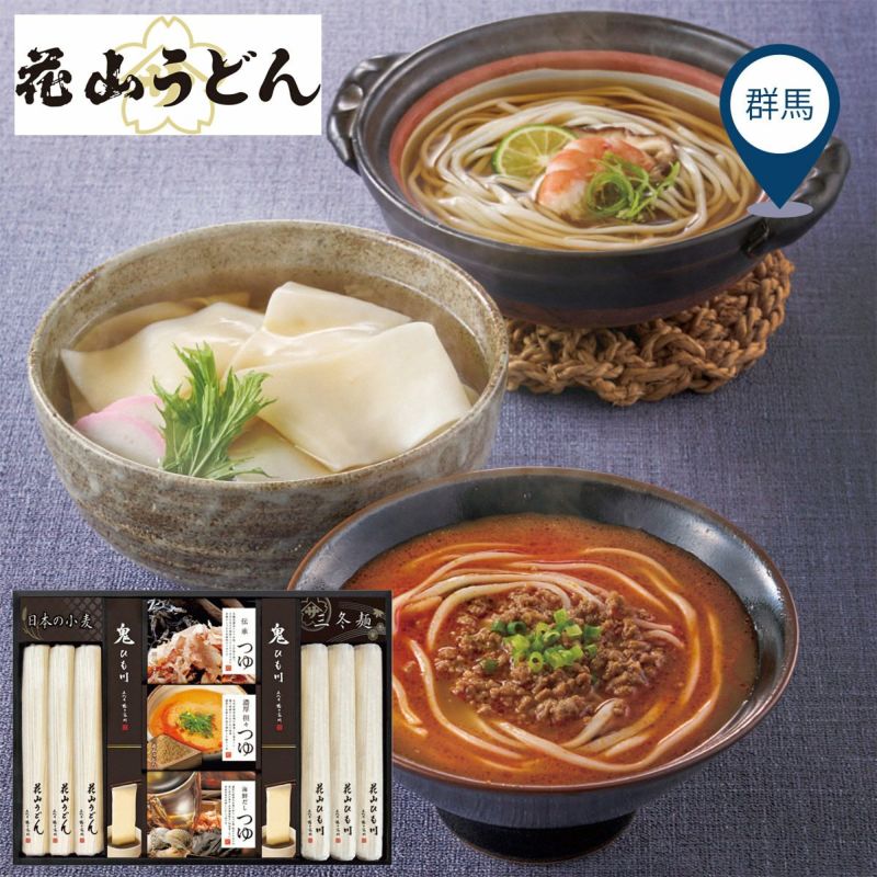 麺(花山うどん×3・花山ひも川×3・鬼ひも川×2)各90g、つゆ(伝承70g×3・海鮮だし60g×3・担々60g×2)