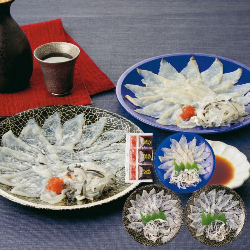 とらふぐ(刺身20g・皮15g)×各2、(真ふぐたたき刺身40g・とらふぐ皮15g)、ポン酢12g・もみじおろし3g×各3(国産原料を使用、山口県にて加工)