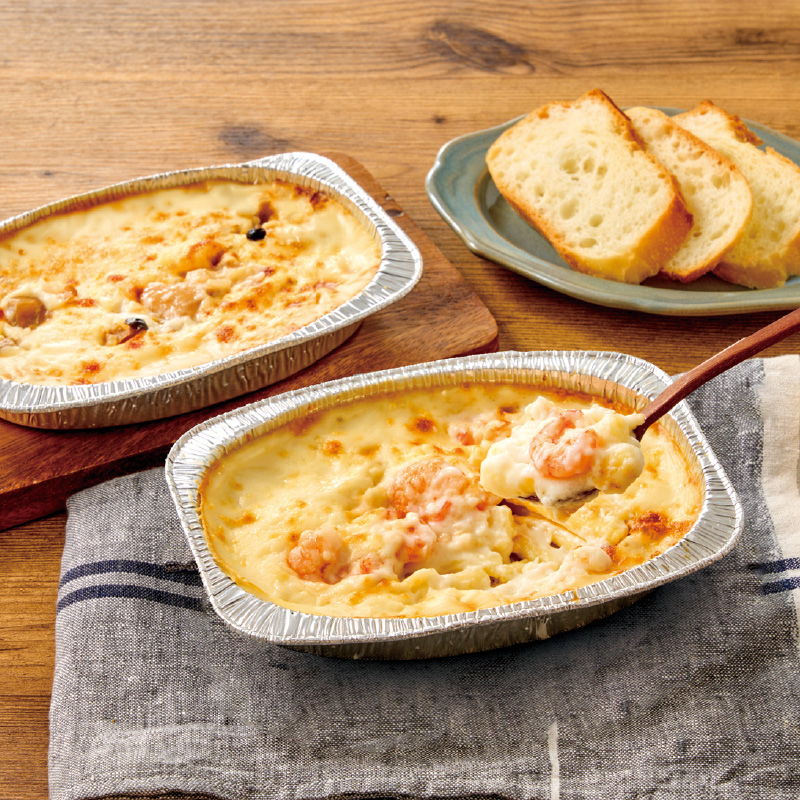 ホワイトソースが特長の海老のマカロニグラタンときのこ香るチキンドリアをセットでお届けします。